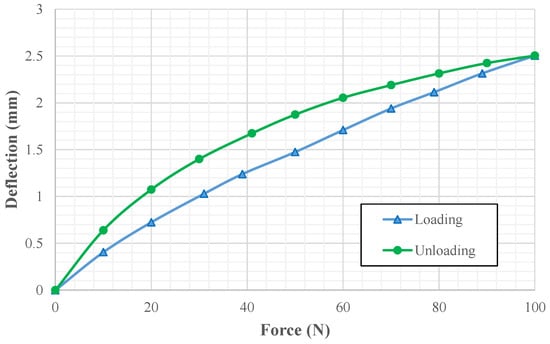 At the beginning, the force indenter testing (Figure 20) for the entire spring structure (without the sensor pill insertion) gave the force vs. spring structure deflection graph as shown in Figure 21 for one testing cycle. The test was carried out as a ten cycle loading and unloading test. The maximum standard deviation was recorded as 0.117 mm (Table 2) for deflection for a given force.