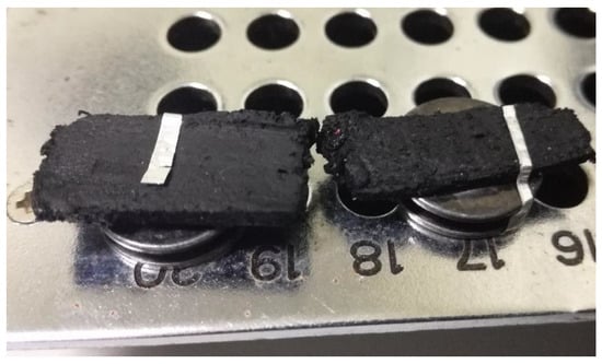 In order to conduct a microscopic and a particle analysis for the conductive polymer samples, a sample preparation method was required. First, the conductive polymer pill was sliced into samples each with a thickness of 2–3 mm using a precision low speed saw and a diamond blade. Later, a partial metallizing using gold sputtering was conducted prior to the analysis. Prepared samples that were mounted on Scanning Electron Microscope (SEM) studs are shown in Figure 15.