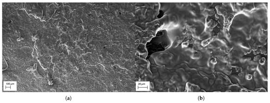 Microscopic images obtained using SEM: (a) at 100× magnification; (b) at 1000× magnification.