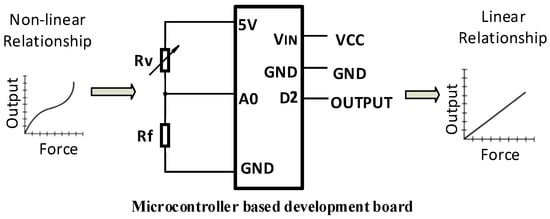 The developed electrical circuit design (Figure 18, denotes the sensing element) uses a micro controller based development board for further signal conditioning and controlling. A 10-bit Analog to Digital Converter(ADC) was utilised to obtain a voltage sensitivity of 0.0048 V. Deriving linear relation from nonlinear outputs taken from sensor pill considering loading condition and hysteresis errors was implemented in the system using a micro controller based development board. Look up table, based on experimental values would be used to obtain force sensor readings from the sensor which also mitigated the nonlinearity of the sensor.
