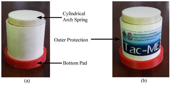 (a) Assembled sensor package; (b) “Tac-ME”: a 1-DoF Tactile sensor with the insertion of conductive polymer based sensing elements.