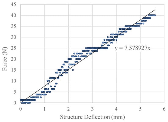 The arch spring structure was prototyped according to the failsafe verifications that were obtained from the FEA study, where the prototyped sensor had five layers of arch springs and two arch springs in parallel in each layer. In order to attain a desired force sensor range, the prime aspect would be to design a single arch with a specific stiffness by considering its width, height (shown in Figure 2), beam thickness and height (shown in Figure 7). In each arc, beam width, beam height, arch width and arch height are 4 mm, 2 mm, 55 mm and 12 mm, respectively, following the terms that were referenced in Figure 2 and Figure 7.