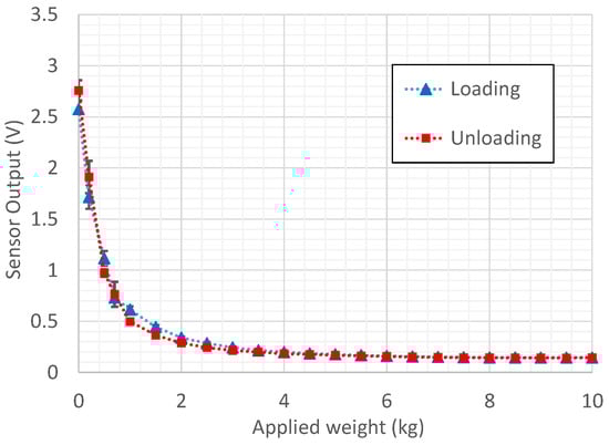 First, the packaged force sensor unit was tested under different methods to find out basic characteristics such as conductivity, force range, hysteresis and nonlinearity. The sensor output characteristics graph (with the variation of its standard deviation) in Figure 22 was obtained using four consecutive load tests using the force indenter. It hardly shows a hysteresis error and shows a significant repeatability due to small error bars that are present, which is a promising aspect in prospective applications. Force measurement using the developed sensor was carried out by comparing the voltage output of the sensor with look-up table values (based on Figure 22) obtained for each 10 N force interval.