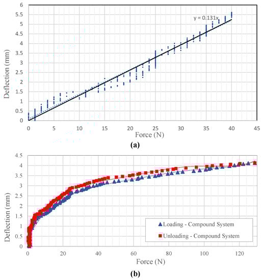 Experiment results using force indenter: deflection vs. applied force plots (a) structure only; (b) compound system.