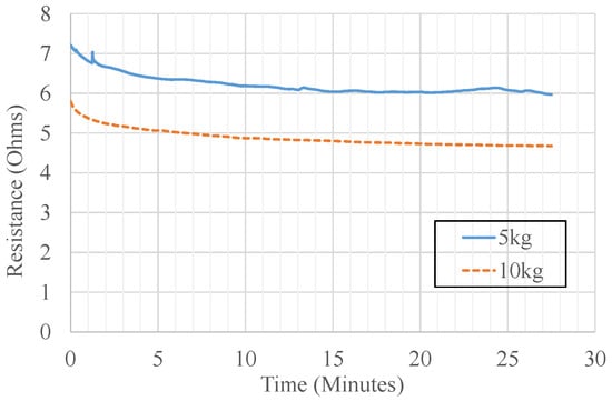 Since the sensor response variation with respect to time is an essential aspect, an experiment was carried out to identify the sensor drift. The resistance was recorded using a high precision multi-meter. According to literature, the porosity of the conductive polymers causes the drift. The drift characteristics have been elaborated in Figure 24 where the output of the sensor, which successfully converges, was observed for two steady loadings (5 kg and 10 kg) for 27 min.