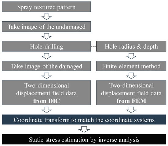 The proposed method introduces the DIC technique into the SRM, with the aim of estimating the static stress in large concrete structures. Rather than using a few strain or displacement data points, we used the two-dimensional displacement field obtained from the DIC, improving the stress estimation quality. As shown in Figure 1, the overall procedure of the proposed method consists of three steps: Obtaining two-dimensional displacement fields from the DIC and the finite element method (FEM), performing a coordinate transformation to have the same origin, and estimating the static stress. This section describes each step in detail.