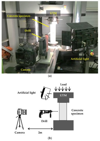 The proposed static stress estimation method is validated through laboratory-scale experiments. A total of five concrete specimens are prepared; their size, elastic modulus, and Poisson’s ratio are summarized in Table 1. The concrete specimens are compressed at approximately 14 MPa by the universal testing machine (UTM) shown in Figure 2. The imposed compressive stress is selected considering that the ultimate strength of the normal concrete specified in most design codes is 12–36 MPa [,]. The applied stress is measured using a load cell integrated within the UTM. An artificial light is placed near the concrete specimen to improve image contrast. A Canon EOS-1D camera equipped with a Canon EF 100 mm MACRO lens is placed at 2 m from the specimen, yielding a resolution of 0.08 mm/pixel. As DIC offers a subpixel resolution up to ±0.02 pixels, the displacement resolution of the camera configuration in this experiment is ±1.6 µm []. A hole with a 10 mm-radius and a 40-mm depth is drilled using a Hilti TE 50-AVR. For all five specimens, the stress estimated by the proposed method is compared with the applied stress. In this section, we first discuss the experimental results of the first test, and then describe the overall cases.