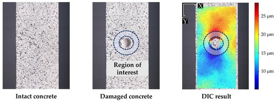 Firstly, the two-dimensional displacement field data is obtained from the DIC: A Gaussian pattern, considered the best choice for the DIC technique [], is applied to the concrete surface. Secondly, the static stress is relaxed by drilling a hole, leading to a redistribution of the displacement field. Lastly, the two-dimensional displacement field is acquired through DIC, by comparing the pattern before and after drilling the hole.