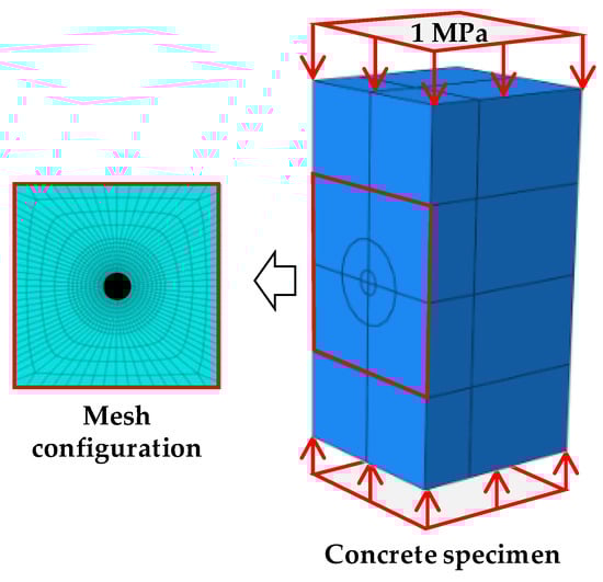 The reference displacement field, which becomes relaxed when the concrete is under a reference uniform stress, is generated through the FEM. Assuming that the concrete structure is within the linear elastic range, the amount of displacement relaxed by drilling the hole is linearly related to the amount of static stress. The product between the static stress and the reference displacement yields the same displacement field acquired by the DIC. Thus, the reference displacement field is established through the FEM, using the specimen information (e.g., the elastic modulus of the concrete, Poisson’s ratio, hole radius, and hole depth).