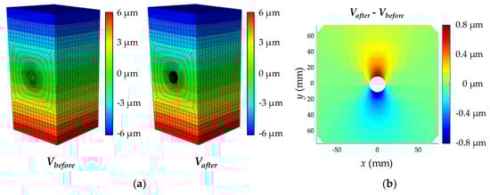 Displacement fields calculated using the FE model: (a) Displacement field of the intact and the damaged concrete, respectively denoted by Vbefore and Vafter, obtained by the FE model; (b) The displacement field due to the hole-drilling.