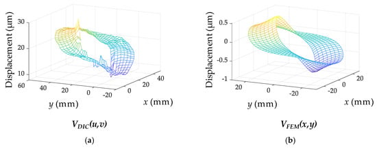 The stress estimation results, shown in Table 2, can be visually verified by comparing the displacement fields from the FEM and DIC. To perform an effective comparison, VFEM and VDIC are adjusted using the estimated stress and rigid body motion in Equation (4), as follows: