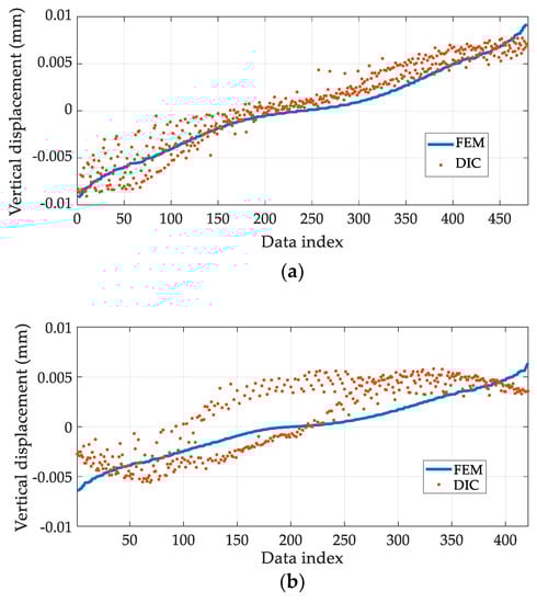 The displacement fields obtained by the DIC and the FEM are shown in Figure 6. The shape of the resulting displacement field from the DIC resembles that from the FEM, whereas the magnitudes of the displacement fields and the origin locations are different between each other. The magnitudes and the origin locations are related to the amount of stress and the rigid body motion, respectively. Using Equation (4), the static stress and rigid body motion are estimated to be 15.53 MPa and 21.4 µm, respectively.