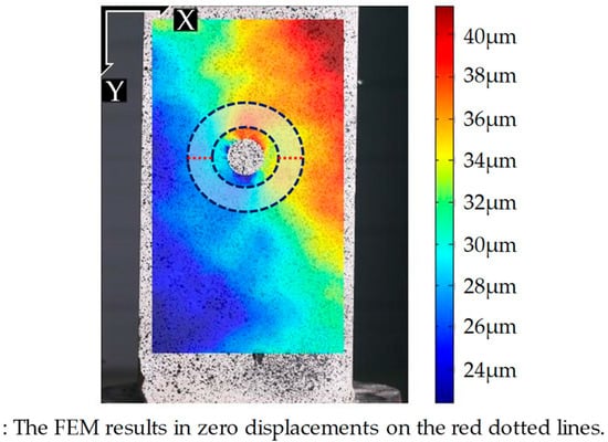 The displacement fields around the hole are calculated from the DIC. Ncorr [] is adopted as a DIC tool to acquire two-dimensional displacement fields, using both the intact and the damaged images (Figure 3). The displacement field in the vertical direction is adopted in the calculation with the assumption that the target structure is in a state of uniform vertical stress. The smallest possible subset (radius = 79 pixels) is manually selected to avoid any discontinuity in the displacement field. The spacing between two consecutive subsets is set at 6 pixels, corresponding to 0.48 mm in the real specimen. Only the displacement field in the region of interest (see Figure 3) is considered in the calculation, due to the occurrence of erroneous DIC measurement in the proximity of the hole. The offset displacement, due to the rigid body motion, is calculated to be approximately 20 µm using Equation (4).
