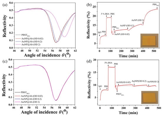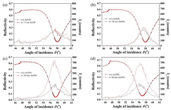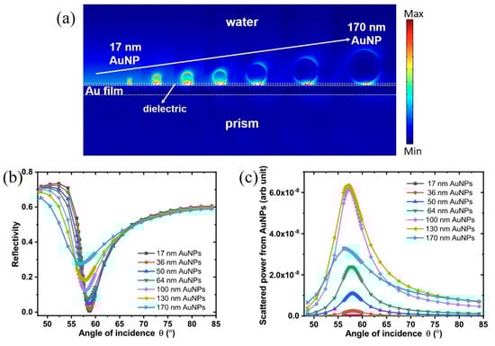 - Uchiho, Y.; Shimojo, M.; Furuya, K.; Kajikawa, K. Optical response of gold-nanoparticle-amplified surface plasmon resonance spectroscopy. J. Phys. Chem. C 2010, 114, 4816–4824. [Google Scholar] [CrossRef]