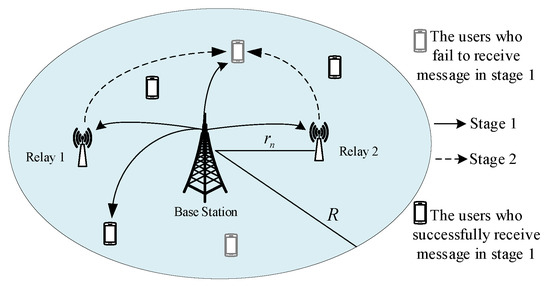 Similar to NOMA, wireless multicast is one of the technologies that is most likely to be applied to 5G and beyond [7,8], with the purpose of saving physical resources and satisfying future point to multipoint services. In the multicast system, the base station (BS) serves multiple users with a single physical resource because these receivers require the same content. To improve the performance of the multicast systems, two-stage cooperative transmission scheme has attracted wide attention [9,10,11,12,13]. For example, in [9], the outage probability and resource allocation for the cooperative multicast scheme are studied. Ref. [10] proposed a probability-based power control method in cooperative multicast communications to minimize the user power consumption. Ref. [11] investigated the energy efficient cooperative multicast, aiming to minimize the total transmission power.