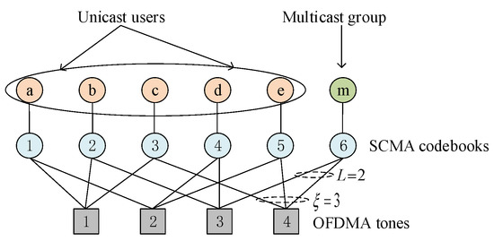 In an SCMA encoder, each user’s data stream with the length of bits is directly mapped to a K-dimensional complex codeword selected from a codebook, where M is the codebook size, K-dimensional codeword over K orthogonal resources (e.g., orthogonal frequency-division multiple access (OFDMA) tones). For each codeword, it is a sparse vector with non-zero elements. Each SCMA layer is assigned with a codebook, and an example of the mapping relationship between SCMA layers and OFDMA tones is shown in Figure 2. Let represents the codebook set of an SCMA block, where the number of codebooks is a function of the codeword length K and the number of non-zero elements L. This work considers the regular codebook, then, the number of non-zero elements in each codebook is equal to L. In the SCMA network, the resource unit is codebook instead of OFDMA tone, and multiple access is achieved by assigning different codebooks to different users. Since multiple codebooks on an SCMA block share the same time-frequency resources, SCMA can achieve overload gain compared to OMA.