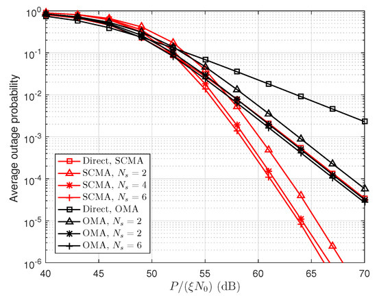 We use (number of relays), (power power allocation factor) and (relay location factor) as an example. Figure 3 shows the average outage probability versus . In Figure 3, the performance of direct transmission and cooperative transmission with different numbers of relays in both SCMA and OMA networks are simulated. We can see that SCMA outperforms OMA in terms of outage probability for both direct and cooperative transmission schemes, which is because users in the SCMA network obtain spreading gain compared to OMA network. The cooperative transmission scheme has lower outage probability compared to direct transmission scheme in the high SNR regime, and the increasing number of relays can reduce the user’s outage probability. For example, maximum gain (about 3 dB) is obtained when is increases from 2 to 6. This phenomenon can be explained the fact that the cooperative transmission provides array gain compared to the direct transmission.