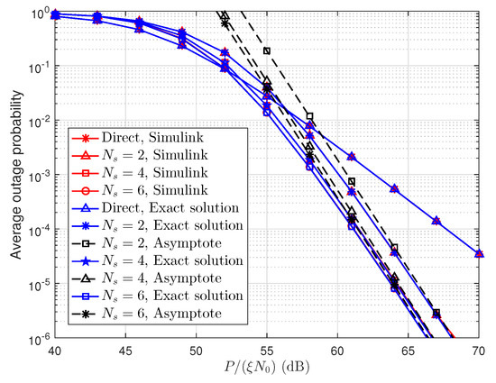 In Figure 5, the simulation and exact (Equation (20)) results of the direct transmission scheme are presented. Meanwhile, the simulation, exact (Equation (27)), and approximate (Equation (33)) results of the two-stage cooperative transmission scheme are also presented. The simulation parameters are the same as in Figure 3. We can clearly see that the exact outage probability curves are in good agreement with the Monte Carlo simulation results. The asymptotic curves almost overlap with the exact performance curves when is large, which verifies our derivation of the average outage probability in the high SNR regime.