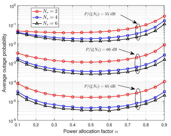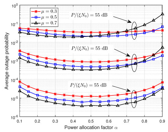 Figure 6 and Figure 7 show that the effect of power allocation factor on the average outage probability, where dB are used as examples. In Figure 6, the number of relays is , and . In Figure 7, the number of relays is , and . From these two figures, we can observe that the power allocation factor has a significant impact on the average outage probability. Thus, it is necessary to find out the optimal power allocation factor. Additionally, the average outage probability decreases first and then increases with the increasing of power allocation factor , and it reaches the minimum value when . This is consistent with the conclusion in Section 4.1, i.e., the first stage occupies half of the total energy consumed.