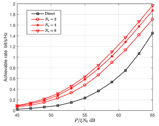 Therefore, the problem of minimizing can be approximated to minimize . The expression of can be rewritten as Equation (41), which is a function of and . For Equation (41), we obtain the optimal for each by Monte Carlo and numerical methods. Table 1 lists the optimal with a different number of relays ( from 2 to 6):
