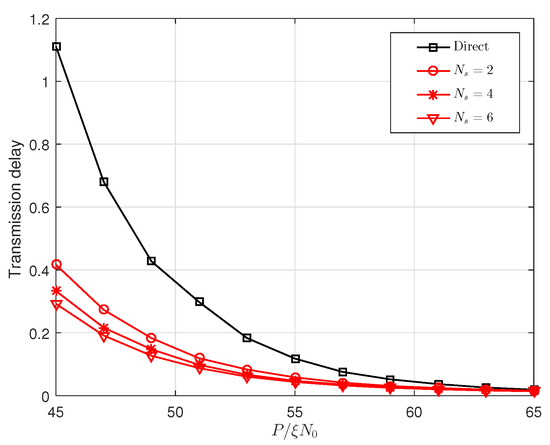 Figure 10 and Figure 11 show that the effect of on the achievable rate and the transmission delay, respectively, where the optimal power allocation factor and optimal relay locations are used. The achievable rate is the maximum allowable transmission rate of each codebook under the constraint of the outage probability ( in Figure 10 and Figure 11). The delay is the time required to transmit a packet at the achievable rate. To be more intuitive, we assume that the size of the packet is 1, and then the delays in Figure 11 are the time required to transmit a unit packet. From the two figures mentioned, we can see that the proposed cooperative transmission has a higher achievable rate and lower delay than the direct transmission scheme.
