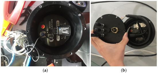 Installation of FOG and AHRS in experiment 1. (a) FOG and AHRS in the waterproof hull; (b) cover of the waterproof hull.