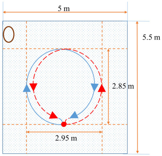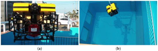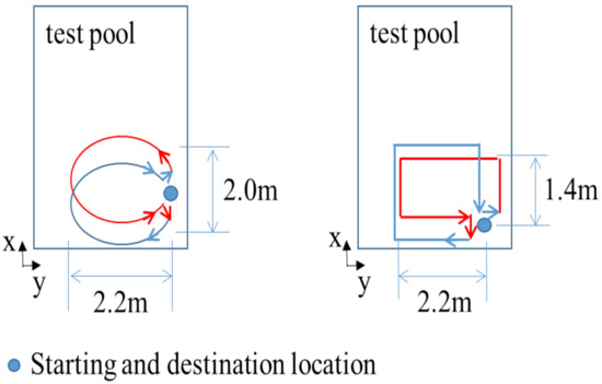 The second experiment used an AHRS (LORD Microstrain 3DM-GX3 25, LORD MicroStrain, Williston, VT, USA) [29] and a DVL (LinkQuest NavQuest 600 Micro, San Diego, CA, USA) [30] installed onto the UUV. The test pool was located in the city of Daejeon, Korea, and the geomagnetic field was set to [25], in accordance with the 2015–2020 world magnetic model with regard to the specific location. The test pool and the UUV are shown in Figure 6. The UUV navigated through the two different trajectories shown in Figure 7—namely, a circular trajectory and a rectangular trajectory. For each trajectory, once the robot circulated and reached its initial location, it turned back and traced the trajectory to the initial location by following the reverse direction. Then, it turned back and traced the previous path, and moved again toward the initial location. The robot repeated this back and forth navigation, and finally returned to its initial location such that the destination of the navigation was the robot’s initial location. The total travel distance of the circular motion was 282.7 m, and the total distance of the rectangular motion was 100.8 m [22]. Because the second experiment did not use a high-end attitude sensor, the attitude estimation performance was analyzed indirectly by comparing the accuracy of the dead-reckoned localization, which depends on the estimated attitude.