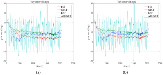 Error of estimated yaw with respect to the yaw provided by FOG is compared. (a) bias estimation is used; (b) bias estimation is not used.