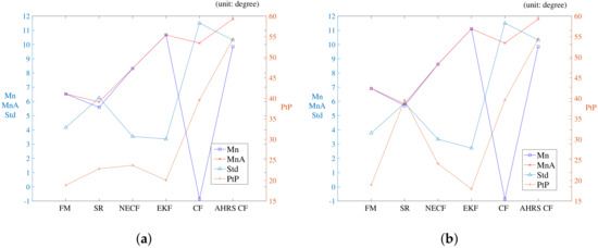 Average, average absolute error, standard deviation, and peak to peak of attitude error obtained with considered methods in experiment 1. (a) bias compensated; (b) bias not compensated.