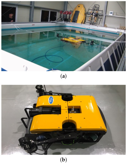 UUV and test tank used in experiment 1. (a) UUV front view; (b) launching UUV into test tank.