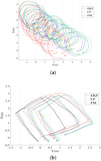 Table 4 describes the distance error of the estimated location at the final destination. Although the drift in the z-direction is not shown in Figure 8, the z-directional error adds to the distance error on the plane shown in Figure 8. Thus, it results in the distance error presented in Table 4. The distance error for the FM is shorter than the errors of the other methods. Although the distance error is not the exact measure of accuracy for the estimated attitude, the result proves that the calculated trajectory based on the proposed method is better than that of the other methods, and indirectly indicates that the proposed attitude estimation method is the most probable one amongst all methods compared in this study.