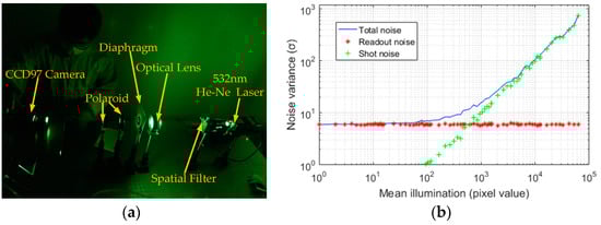 Real noise analysis for charge-coupled device (CCD) image sensor. (a) Experimental platform for noise analysis of CCD image sensor; (b) computed the Photon Transfer Curve (PTC) according to the measurement of [,].