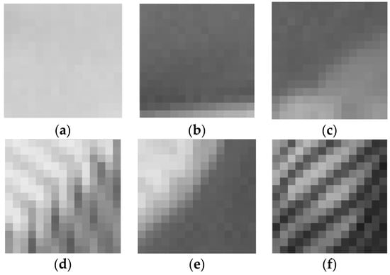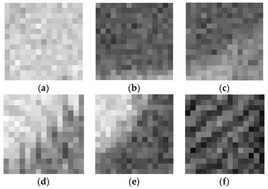Local gray statistic entropy of various noise-free image blocks, and weakly textured blocks have relatively bigger local gray statistic entropy (LGSE) values; (a) = 7.8135; (b) = 7.7972; (c) = 7.7761; (d) = 7.7618; (e) = 7.7158; (f) = 7.6994.