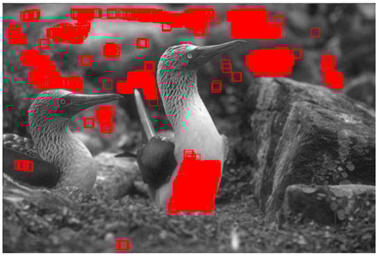 An example for homogenous blocks selection, and those 15 × 15 red boxes in the “Birds” image have outlined the finally selected homogenous blocks.