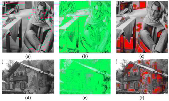 Two examples for homogenous blocks selection in the “Barbara” and “House.” (a) Original “Barbara” image; (b) the selected blocks after histogram constraint in “Barbara” image are labeled with green color; (c) 15 × 15 red boxes in the “Barbara” image have outlined the finally selected homogenous blocks; (d) original “House” image; (e) the selected blocks after histogram constraint in the “House” image are labeled with green color; (f) 15 × 15 red boxes in the “House” image have outlined the finally selected homogenous blocks.
