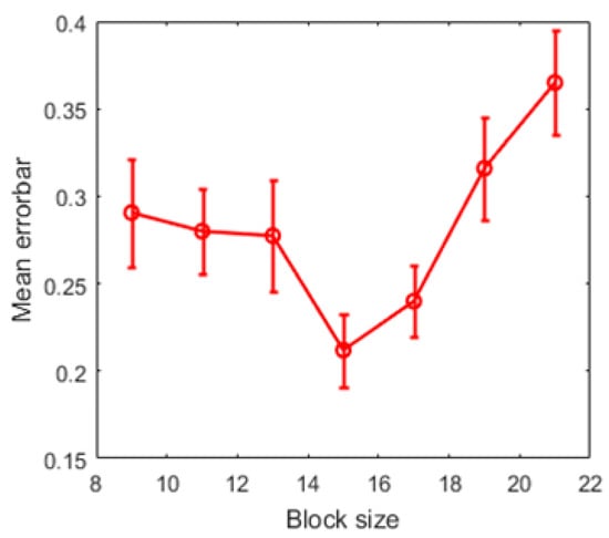 The mean error-bars of different block sizes. Thus, when the block size , the proposed algorithm has an overwhelming advantage for its accuracy and stability.