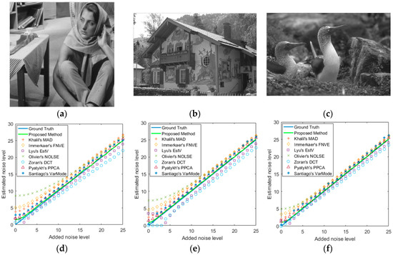 Different AWGN level estimation methods on three images, and the proposed method outperforms other several existing noise estimation methods. (a–c) are original images (“Barbara,” “House,” “Birds”); (d–f) are their results of noise level estimation respectively.