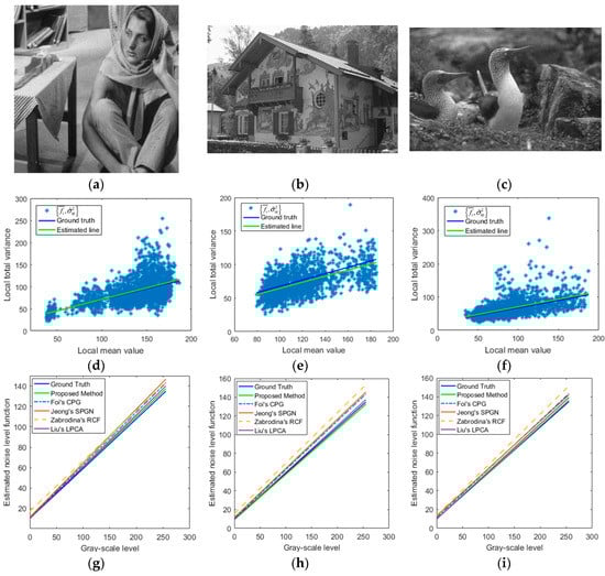 Different Poisson-Gaussian noise (PGN) level estimation methods on three images, and the proposed method out-performs several existing PGN estimation methods. (a–c) are noisy images (“Barbara,” “House,” “Birds”) with and ; (d–f) are the results of our parameter estimation algorithm respectively; (g–i) are the results of different PGN estimation methods respectively.