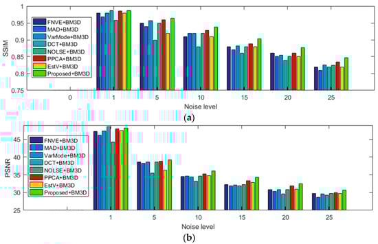 Structural similarity index measurement (SSIM) and peak signal-to-noise ratio (PSNR) comparison results of different AWGN estimators with BM3D for blind de-noising on the 134 selected images at different noise levels. (a) Comparison results of SSIM; (b) comparison results of PSNR.