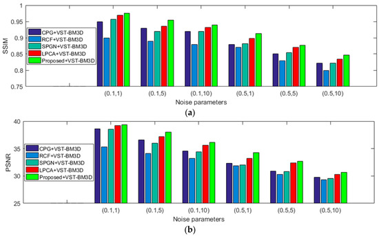 SSIM and PSNR comparison results of different PGN estimators with VST-BM3D for blind de-noising on the 134 selected images at different noise parameters. (a) Comparison results of SSIM; (b) comparison results of PSNR.