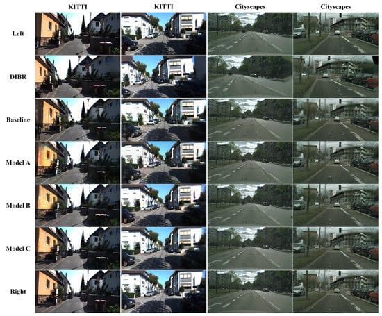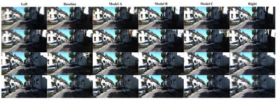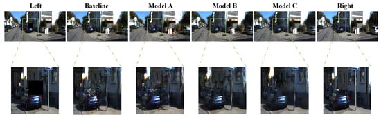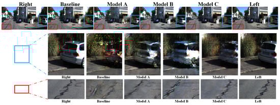 Figure 10. According to the theory of binocular vision, the different regions always occur in the left-side or right-side. Thus, two regions of every image are selected for comparison in this experiment. The blue box focuses on the right area and the red box focuses on the left area. Although the left virtual view reconstruction of model C is not the same as the ground truth, it approaches the ground truth and shows the best performance in comparison of texture regeneration and left–right consistency with other models.