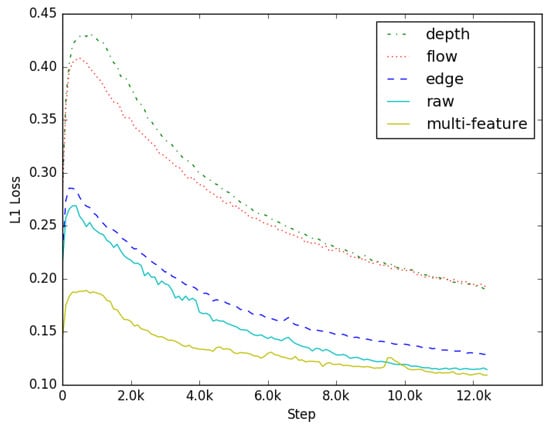 The result shows that the shape feature is much better than the spatial feature when using a single type of feature to restore the virtual view, but they all have poorer quality of images and slower convergence rate than raw data. Using multi-feature fusion in training, we find that the initial value of loss is much lower and the model can converge more quickly. The reason is that the model has learnt the prior data distribution according to the multi-feature early in the training. However, the more information available as input, the longer inference time the model has. To reduce the inference time of a generative network, edge map, depth map, and optical flow are selected as additional information.