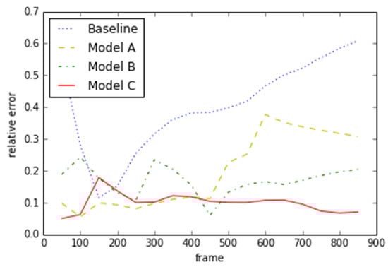 y-axis corresponds to the relative errors of different models. The baseline model (blue line) has the highest relative error. With the modification of model A, model B, and model C, the results improve continuously. Model C (red line) outperforms the others in the KITTI dataset. According to the statistics of trajectory relative error, as shown in the