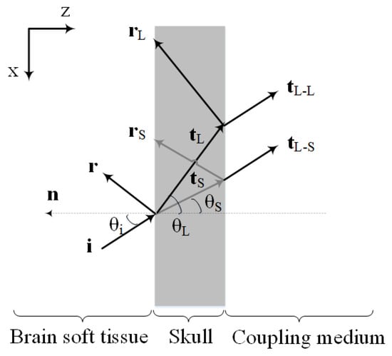 Schematic illustration of the PA wave transmission through the skull. The interfaces are assumed to be parallel with the Cartesian coordinates, where z is oriented orthogonal to the interfaces and x runs along the interface plane. Here, denotes the incident ray direction vector, denotes the reflected ray direction vector and denotes the transmitted ray direction vector (the subscripts L and S refer to the longitudinal and shear rays, respectively). Also and are the longitudinal transmitted ray direction vectors generated by the incident longitudinal and shear rays in the skull, respectively. , and are the angle of incidence, longitudinal transmittance, and shear transmittance, respectively. is the normal vector orthogonal to the interface.