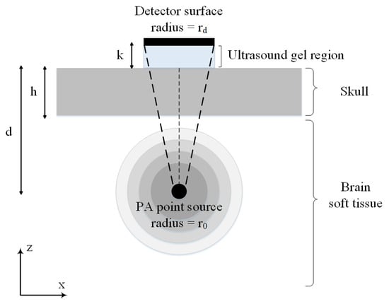 The imaging target is a spherical absorber inside the brain tissue (as shown in Figure 2). It is assumed that the tissue is illuminated with a Gaussian laser pulses to generate the initial pressure rise at the location of the absorber. The absorbing compartments acted as sources of acoustic waves that isotropically propagate waves. The spatial and temporal distribution of such acoustic pressure is found via convolution of the PA impulse response with the Gaussian laser function, written as []: