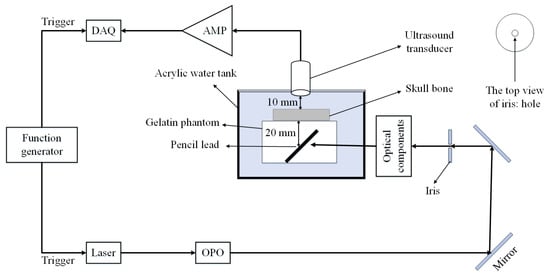 The proposed model is validated using the experimental setup depicted in Figure 3. It consists of a flat ultrasound transducer (Technisonic ISL-0504-GP research immersion transducer, 5 MHz, element diameter: 0.5 inch, and 6 dB fractional bandwidth: 36%), a data acquisition system including a processing unit (National Instrument FPGA-based system, 16 Channels, 14 Bit, max sampling rate: 250 MS/s), a low-noise amplifier (ZFL500LN, Minicircuit, New York, NY, USA) with the gain of 24 dB, and a DC power supply of 15 V, and 60 mA. The light illumination is performed using 7 ns duration pulses and 30 Hz repetition rate generated by an Nd:YAG laser (Spectraphysics Q-Switched laser) [,]. Other parts of the system are illustrated in Figure 3.