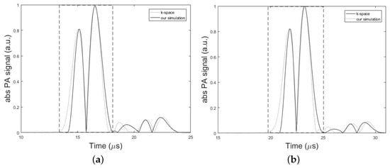Numerical validation of the proposed method versus the k-space algorithm. Absolute PA signal profiles simulated by k-space algorithm (dotted line) and our simulation method (solid line). Dashed rectangles show the main bipolar pulse of the simulated PA signal. In these simulations, the setup in Figure 2 with the parameters, h = 7 mm, k = 10 mm, = 1 mm, = 0.025 inch, and T = 5 cm is used. (a) Minimum error of 0.11% obtained for d = 1.7 cm. (b) Maximum error of 0.25% obtained for d = 2.7 cm.