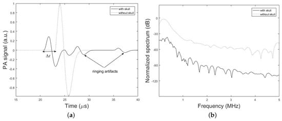 Simulation results. (a) PA signals simulated by our simulation method in the presence and absence of a skull tissue. The setup in Figure 2 with the parameters, h = 7 mm, d = 2.7 cm, k = 10 mm, = 1 mm, = 0.25 inch, and T = 5 cm is used. (b) Corresponding frequency spectrum of the simulated PA signals.