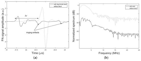 Another observation was the signal distortion occurred at the skull–tissue interface due to the reflection of PA waves, along with the resultant time-domain ringing artifacts at the end of the signal (see Figure 6a). Effect of these multiple reflections of the PA wave at the inner and outer surfaces of the skull may mistakenly be interpreted as signals generated by optical absorbers located deeper inside the brain, which further deteriorate the reconstructed images.
