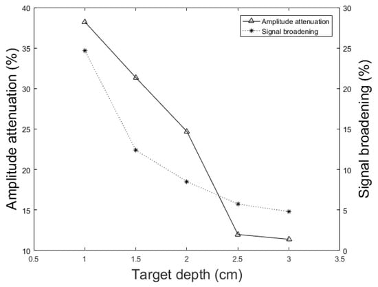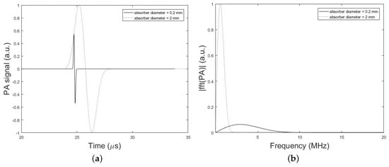 We demonstrated that the frequency bandwidth of the emitted PA wave and consequent frequency-dependent attenuation were also affected by the PA absorber size such that the smaller absorbers emitting broader band waves (see Figure 8). Also, the signal intensity attenuation largely depends on the size of the absorber and it is expected that the stronger amplification will be needed for signals originating from small absorbers.